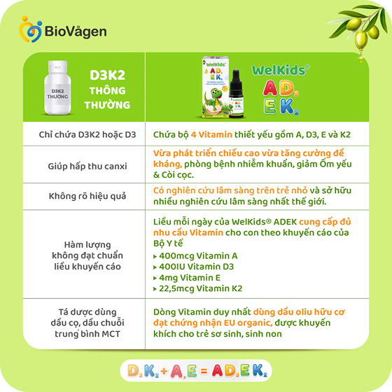 "WelKids ADEK là sản phẩm duy nhất tại Việt Nam bổ sung 4 Vitamin thiết yếu A, D3, E, K2 cho trẻ nhỏ từ độ tuổi sơ sinh. Như vậy, chỉ với một sản phẩm là đã đủ về chủng loại Vitamin quan trọng lẫn đủ về hàm lượng khuyến cáo. Vừa đảm bảo sức khỏe, sự phát triển của con mà vừa tiện dụng cho các mẹ."